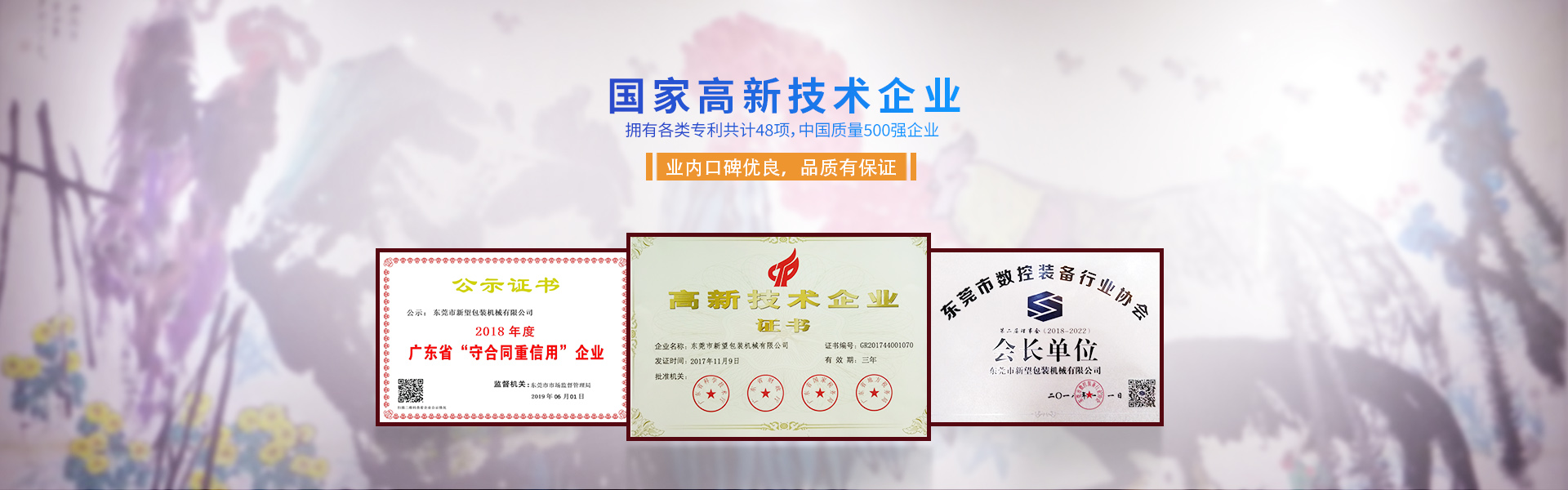 新望機械成立于1998年,位于東莞市東部工業(yè)園區(qū)的中心地帶——企石鎮東平村,交通方便、環(huán)境優(yōu)美舒適、視野開闊。公司注冊資本2000萬元,擁有辦公室、廠房等18,000多平方米。已通過ISO9001:2015國際質量管理體系認證,擁有國家各類專利共計58項。是東莞市企石鎮工商聯副會長單位、東莞市企石鎮文學藝術界聯合會副主席單位、東莞市環(huán)保包裝行業(yè)協會副會長單位、東莞市數控裝備行業(yè)協會第二屆會長單位、廣東省包裝技術協會常務理事單位、廣東省膠粘劑行業(yè)協會理事單位、廣東省著名商標企業(yè)、國家高新技術企業(yè)。